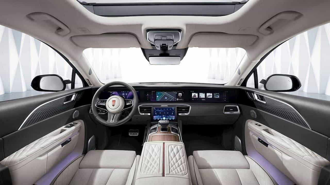 В интерьере доминируют натуральные материалы. Элементы салона отделаны кожей Наппа, полированным алюминием, древесиной высокого качества. Панорамный люк визуально увеличивает пространство и дарит чувство свободы. Машина оснащена тремя ЖК-дисплеями, расположенными рядом и образующими один большой экран. Кнопки в Hongqi заменены сенсорами – чувствительными к прикосновению.